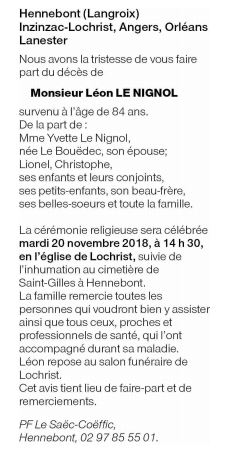 Décédé à Hennebont (56700, France) le vendredi 16 novembre 2018 à l'âge de 84 ans