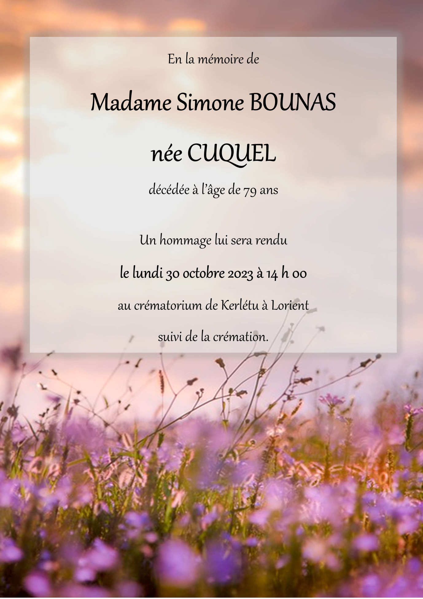 Décédée à Hennebont (56700, France) le mardi 24 octobre 2023 à l'âge de 79 ans