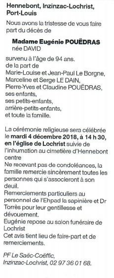 Décédée à Inzinzac-Lochrist (56650, France) le samedi 1 décembre 2018 à l'âge de 94 ans