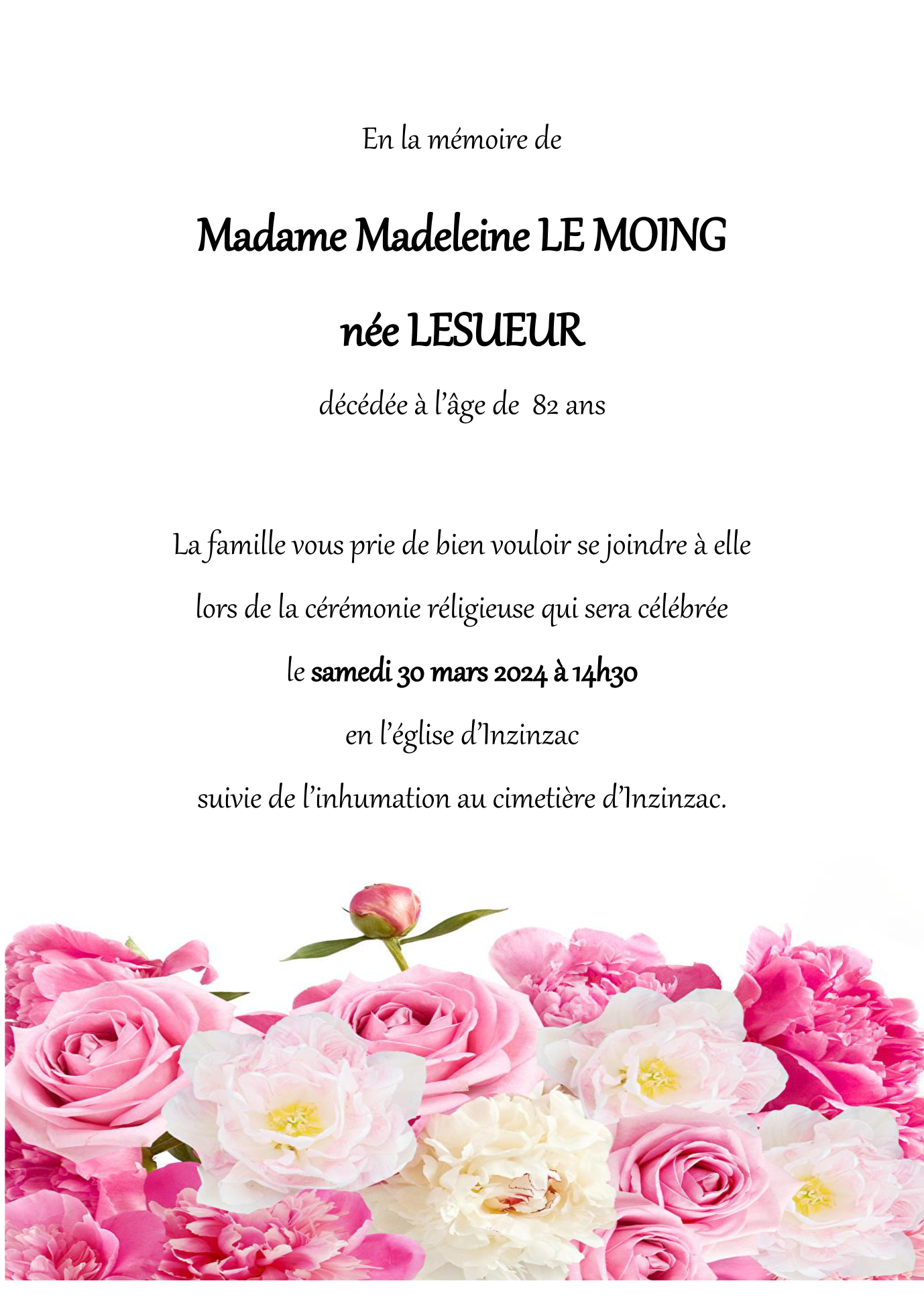 Décédée à Inzinzac-Lochrist (56650, France) le mercredi 27 mars 2024 à l'âge de 82 ans
