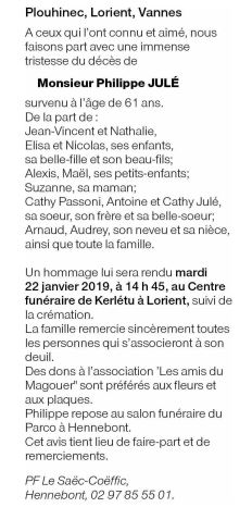 Décédé à Brest (29200, France) le lundi 14 janvier 2019 à l'âge de 61 ans