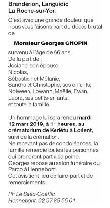 Décédé à Branderion (56700, France) le vendredi 8 mars 2019 à l'âge de 66 ans