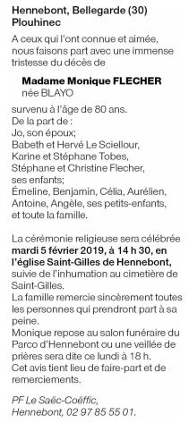 Décédée à Lorient (56100, France) le jeudi 31 janvier 2019 à l'âge de 80 ans