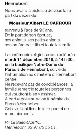 Décédé à Grand-Champ (56390, France) le vendredi 7 décembre 2018 à l'âge de 96 ans